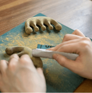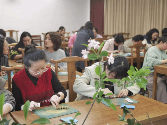 女老师们在非遗匠人的指导下,用砂纸打磨经络梳、木梳、木质挂件等器物,木头与砂纸摩擦,粗糙的木头在老师们的耐心与细心的打磨中变成了一件件精美的手工艺品,活动氛围其乐融融。