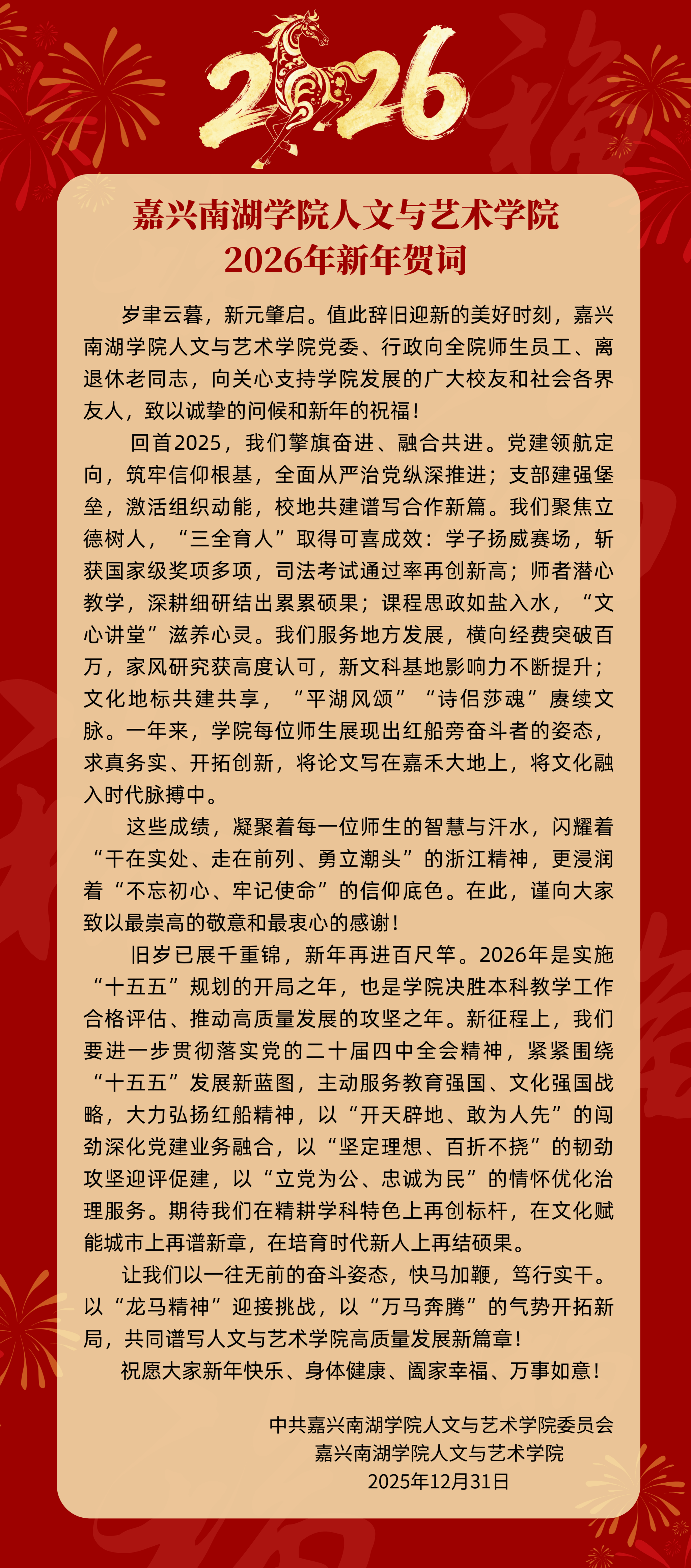 旧岁已展千重锦,新年再进百尺竿。2026年是实施“十五五”规划的开局之年,也是学院决胜本科教学工作合格评估、推动高质量发展的攻坚之年。新征程上,我们要进一步贯彻落实党的二十届四中全会精神,紧紧围绕“十五五”发展新蓝图,主动服务教育强国、文化强国战略,大力弘扬红船精神,以“开天辟地、敢为人先”的闯劲深化党建业务融合,以“坚定理想、百折不挠”的韧劲攻坚迎评促建,以“立党为公、忠诚为民”的情怀优化治理服务。期待我们在精耕学科特色上再创标杆,在文化赋能城市上再谱新章,在培育时代新人上再结硕果。
